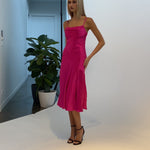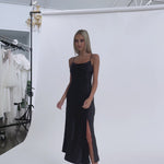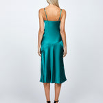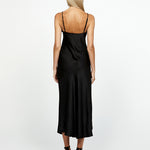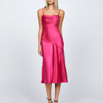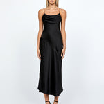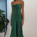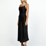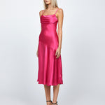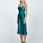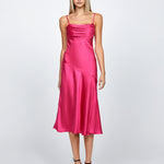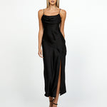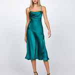 Add a touch of elegance to your bridal party with this chic PEITA SATIN COWL NECK MIDI dress featuring a flattering scooped cowl neckline and delicate thin spaghetti straps, ideal for bridesmaids. The fitted bodice accentuates the figure beautifully, while the bias-cut midaxi length straight skirt exudes sophistication and grace. A high front side skirt split adds movement and a hint of flair to this timeless ensemble. Perfect for weddings, formal events, or special occasions, this dress is versatile and flattering for all bridesmaids. Embrace effortless style and grace with this classic piece that complements any bridal theme and setting.