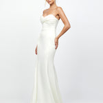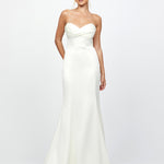 Make a lasting impression in this exquisite satin gown featuring a sweetheart strapless neckline with a chic twist bust panel. The structured bodice, complete with built-in bust cups and boning, ensures a flawless and supportive fit. Flowing into a dramatic full-length fishtail skirt with an elegant train, this dress combines timeless sophistication with graceful movement. Finished with full lining and an invisible back zip closure, and a skirt length of 118cm, this gown is perfect for formal occasions, weddings, or any event where you want to shine with classic elegance.