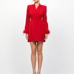 Embody the elegance of FEATHER CUFF BLAZER DRESS, boasting an elegant twist on the usual tailored blazers. The crossover front detail and built-in shoulder pads ensure a flattering silhouette, while full-length sleeves adorned with delicate feather trim add an exquisite feminine touch. With its mini-length wrap-style skirt, this dress radiates sophistication, making it perfect for any bridal shower or high tea affair. Elevate your style and charm with this enchanting ensemble, designed to captivate attention at every occasion.