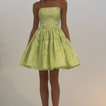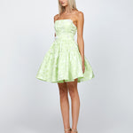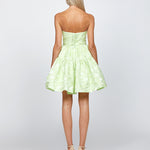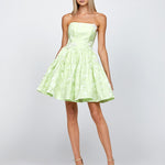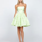 The Posy is a masterpiece of modern elegance, crafted with a sleek straight-across strapless neckline that highlights the collarbones with refined simplicity. Its playful mini-length skirt, designed with tiered circle layers and delicate gathers, adds a flirtatious flair to every step. Allover floral trims cascade across the bodice and skirt, creating a garden-like charm in exquisite detail. An invisible back zip ensures a seamless finish, while the full lining and stiff mesh interlining provide structure and comfort.