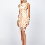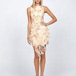 Make a bold statement with this eye-catching mini dress, featuring a high rounded neckline for a sleek and modern look. The tapered waistline, with a keyhole back, adds a touch of allure while offering a flattering silhouette. The fitted mini skirt is adorned with tiered asymmetric cascading ruffles, creating dynamic movement and a playful edge. Complete with an invisible back zip closure and full lining, this dress is crafted from a combination of shimmering printed sequins and lightweight chiffon, perfect for standing out at any event.
