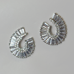 Turn every moment into a spotlight moment with the Radiant Spiral Luxe Statement Earrings. Designed in a sweeping crescent silhouette, these earrings feature a stunning arrangement of elongated, glass-cut stones that fan outward for maximum shimmer. The inner curve is lined with clusters of sparkling pavé crystals, adding depth, dimension, and an ultra-glam shine.