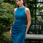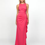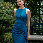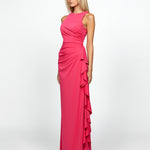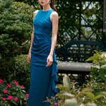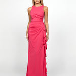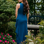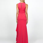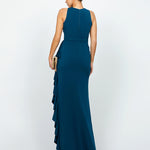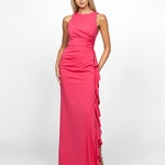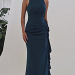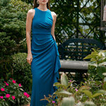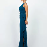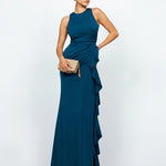 Step into sophistication with our RAELYNN HIGH NECK FRILL GOWN featuring a high halter neckline that exudes modern elegance. Built-in bust cups provide support, while side front pleats at the waist and skirt offer a flattering silhouette. The full-length column skirt includes a side front split for graceful movement, accentuated by a cascading side frill feature that adds a touch of drama. Fully lined for comfort and equipped with an invisible zip closure at the back, this gown ensures a seamless fit and refined finish. Perfect for formal events or special occasions, it combines classic style with contemporary allure for an unforgettable entrance.