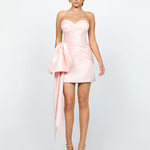 Turn heads and steal the spotlight in this stunning satin mini dress, designed for the ultimate statement look. Featuring a strapless sweetheart neckline with a bustier-style bodice and gathered detailing, this dress beautifully contours and flatters your figure. The built-in bust cups provide extra support, while the detachable dramatic side bow adds a playful yet sophisticated touch.