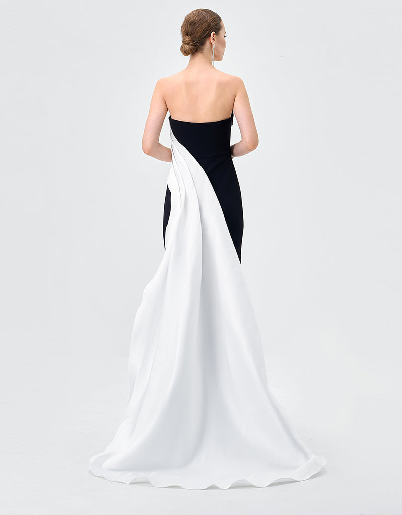 Satin bodice with asymmetric drape and floor sweeping back train