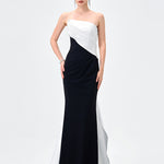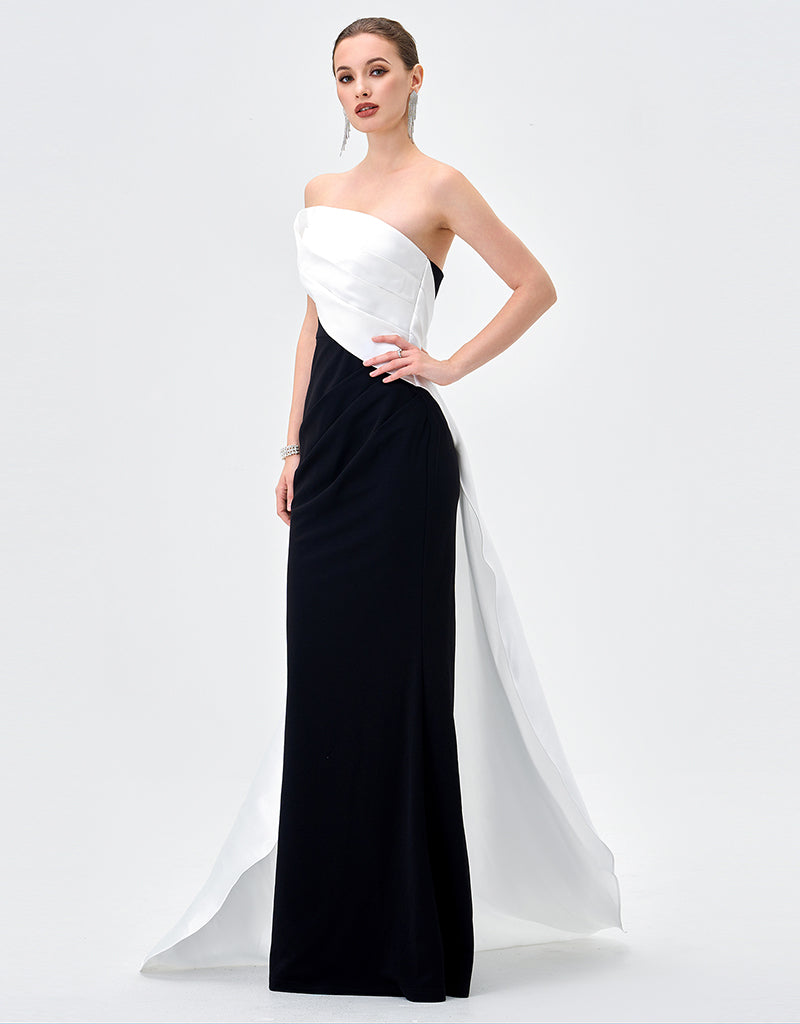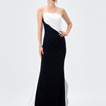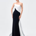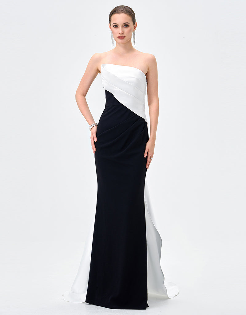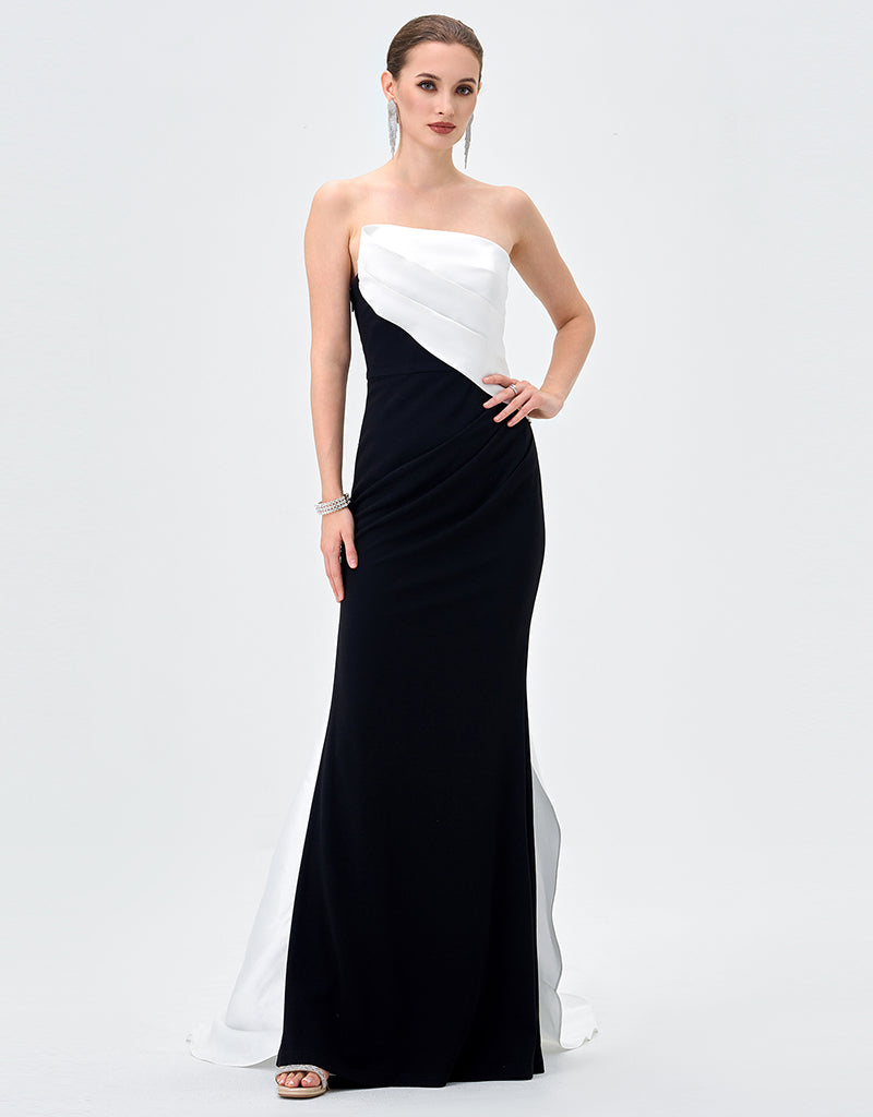 A striking take on modern elegance, this strapless gown pairs sculptural satin with sleek crepe jersey for a flawlessly contoured silhouette. The asymmetrical neckline is softly draped across the bodice, creating a directional finish that feels effortlessly refined, while built-in cups offer secure support and a smooth, flattering fit. Falling into a fitted floor-length skirt with subtle side waist pleating, the look is finished with a dramatic floor-sweeping back train for elevated impact. Fully lined and secured with an invisible side zip, it’s the ultimate choice for formal evenings and statement entrances.