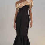 Turn heads in this elegant dress featuring a one-shoulder neckline with a layered frill detail for a dramatic touch. The built-in cups and structured bodice provide a flawless fit and support. The midaxi-length skirt showcases a gathered mermaid flounce hemline, adding a touch of sophistication and movement. An invisible back zip closure ensures a smooth, streamlined look, while full lining offers comfort and structure. Ideal for formal events or special occasions, this dress blends contemporary design with classic elegance for a memorable appearance.