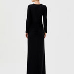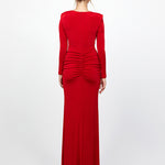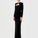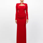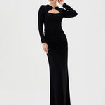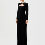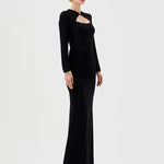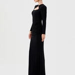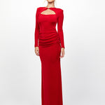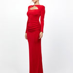Daring yet sophisticated, this full-length gown is designed to captivate. Featuring a high neckline with a bold wide triangle cut-out, it strikes the perfect balance between coverage and allure. The fitted long sleeves create a sleek silhouette, while the soft drape jersey fabric hugs the body in all the right places. Side and back ruching detail add a flattering touch to the column-style skirt, enhancing your natural curves. Complete with an invisible back zip and partial lining, this gown is the ultimate choice for statement evening dressing, cocktail events, or black-tie affairs.