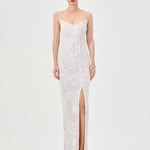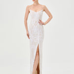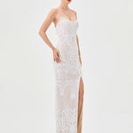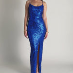 The stunning Sera Strappy Back Sequin Gown, designed to dazzle from every angle. Featuring a flattering scoop neckline with delicate spaghetti straps, this gown offers a structured boned bodice with built-in cups for a supportive, sculpted fit. The open back showcases a chic tie-up detail, adding a touch of drama and elegance. Crafted from shimmering patterned sequin fabric, the full-length column skirt flows effortlessly with a sultry front side split for ease of movement and added allure. Finished with a discreet invisible zip and full lining for a smooth, comfortable wear, this gown is perfect for your next formal event or special occasion.