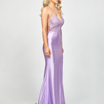This breathtaking gown exudes sensuality and sophistication with its daring yet elegant design, making it the perfect choice for any formal occasion or evening affair. The plunging V-neckline creates a striking, bold silhouette, while the low open back with cross-over tie detailing adds a touch of drama and allure. A nude-colored modesty panel offers just the right amount of coverage, balancing the daring neckline, and built-in cups provide support for a flawless fit.