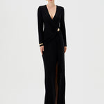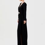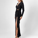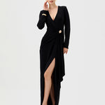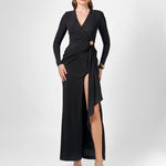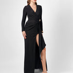 Elegance meets allure in this beautifully draped jersey gown. Featuring a crossover V-neckline and fitted long sleeves, the silhouette is sleek, flattering, and effortlessly refined. The cinched waist is accentuated with a chic metal trim detail and soft side sash, creating a defined hourglass shape. The column-style maxi skirt flows into a high front side split, offering movement and a touch of drama. Made from soft, stretch drape jersey with partial lining and an invisible back zip, this style balances comfort and glamour — perfect for weddings, evening events, and formal occasions.
