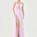 This gown is designed with a plunging sweetheart neckline, balanced by built-in cups and a sheer mesh insert for coverage. The fitted bodice is crafted from floral lace with exposed boning for structure, while the floor-length skirt is detailed with a thigh-high split for ease of movement. Partially lined through the bodice and fully lined through the skirt, finished with an invisible zip closure at the back.