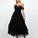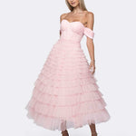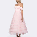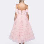 Indulge in timeless elegance with our THEODORA OFF SHOULDER TEA LENGTH MIDI featuring an off-shoulder sweetheart neckline and detachable short sleeves for customizable allure. The pleated bodice adds texture and sophistication, while the lace-up back ensures a flawless fit. The multi-tiered skirt brings a touch of romance and movement, making this dress a captivating choice for any special occasion. Experience the perfect blend of classic and modern elements in this enchanting ensemble.