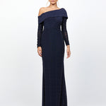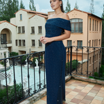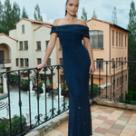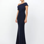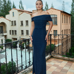 Make an entrance in this show-stopping gown, crafted from shimmering diamante mesh that catches the light with every step. Featuring a romantic ruched off-shoulder neckline and detachable full-length ruched sleeves, this piece offers versatile styling for any special occasion. The fitted silhouette flows into a dramatic maxi-length fishtail skirt, sculpting a timeless hourglass shape. Fully lined and finished with an invisible back zip, this gown is the epitome of glam sophistication.