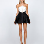 legance meets playful charm with this stunning strapless mini dress. Featuring a sweetheart neckline with a detachable floral trim, this design offers versatility and a touch of romantic detail. The structured V-waistline, complete with pleat detailing and a modesty panel, flatters the figure and creates a beautifully defined silhouette.