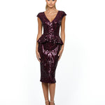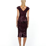 Never give a cold shoulder in the Venus. Capped sleeve with an overlay skirting at the waist adds to the drama of the luxe- sequin pattern dress. Pair with a simple nude or gold heel to maintain the neutral tones.