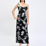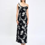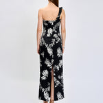 Turn heads in this elegant satin midaxi dress, crafted with a striking asymmetric neckline featuring a bold off-shoulder strap paired with a delicate spaghetti strap for a modern, romantic touch. The fitted bodice is adorned with a soft fabric rosette, adding a feminine statement detail. A sleek pencil skirt skims the figure and falls to a midaxi length, complete with a back split for ease of movement. Fully lined and finished with an invisible back zip, this dress is designed to flatter and captivate at any formal event.