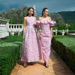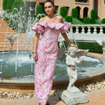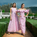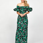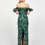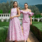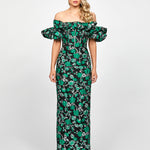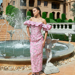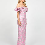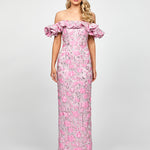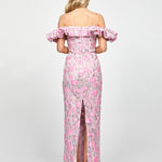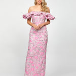 Embrace timeless elegance with this burnout jacquard gown, designed to captivate with its romantic details and flattering silhouette. The off-shoulder neckline is beautifully framed by elasticated ruffle sleeves, adding a soft, feminine touch. A fitted bodice with an exposed corset feature enhances the waist for a structured, cinched look, while the column maxi skirt drapes effortlessly, complete with a back split for ease of movement. Fully lined for comfort and finished with an invisible back zip closure, this dress is the perfect choice for any sophisticated occasion.