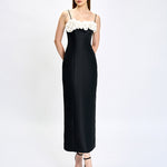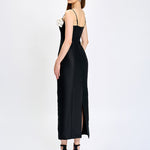 Elegant and refined, this midaxi dress is crafted from luxe thick satin for a smooth, structured finish. Featuring a straight-across neckline adorned with delicate floral appliqué and adjustable spaghetti straps, the bodice offers a soft romantic touch with a tailored fit. The sleek column silhouette falls to a midaxi length and includes a subtle back split for ease of movement. Fully lined and finished with an invisible back zip closure, this timeless piece is perfect for weddings, special occasions, or elevated evening events.
