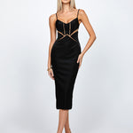 Make a bold statement in this stunning midi dress, designed with a flattering V-neckline and delicate thin spaghetti straps. The geometric, strategically placed cut-out details at the bodice are elegantly covered with a fine mesh for a modern yet sophisticated touch. The midi-length fitted skirt hugs the figure, with a back split for added allure and movement. An invisible back zip closure ensures a sleek finish, while the full lining adds comfort and structure. Perfect for an evening out or a special event, this dress combines contemporary style with classic refinement.