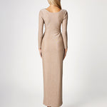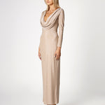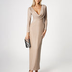 Our YVETTE REVERSIBLE MAXI DRESS, offers both a sophisticated cowl neckline and a versatile rounded neckline to suit your mood. Designed with full sleeves, it's ideal for embracing winter's chill in style. The column-style maxi skirt flows elegantly, complemented by a side invisible zipper for easy wear. Fully lined for comfort and a seamless fit, this dress is a must-have for effortlessly transitioning from day to evening, whether for cozy winter gatherings or elegant formal occasions.