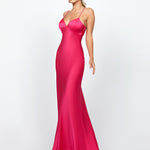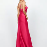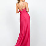 A bold and elegant choice for your next event. Featuring a plunging sweetheart neckline with delicate spaghetti straps, this gown offers a sleek and flattering silhouette. The open back detail, accented with gold metal hardware trim, adds a luxe touch of glamour.