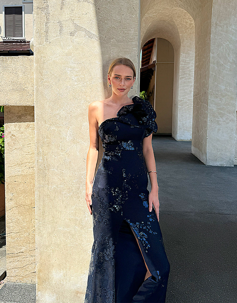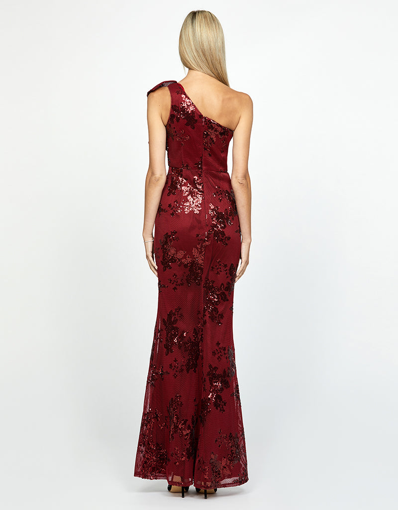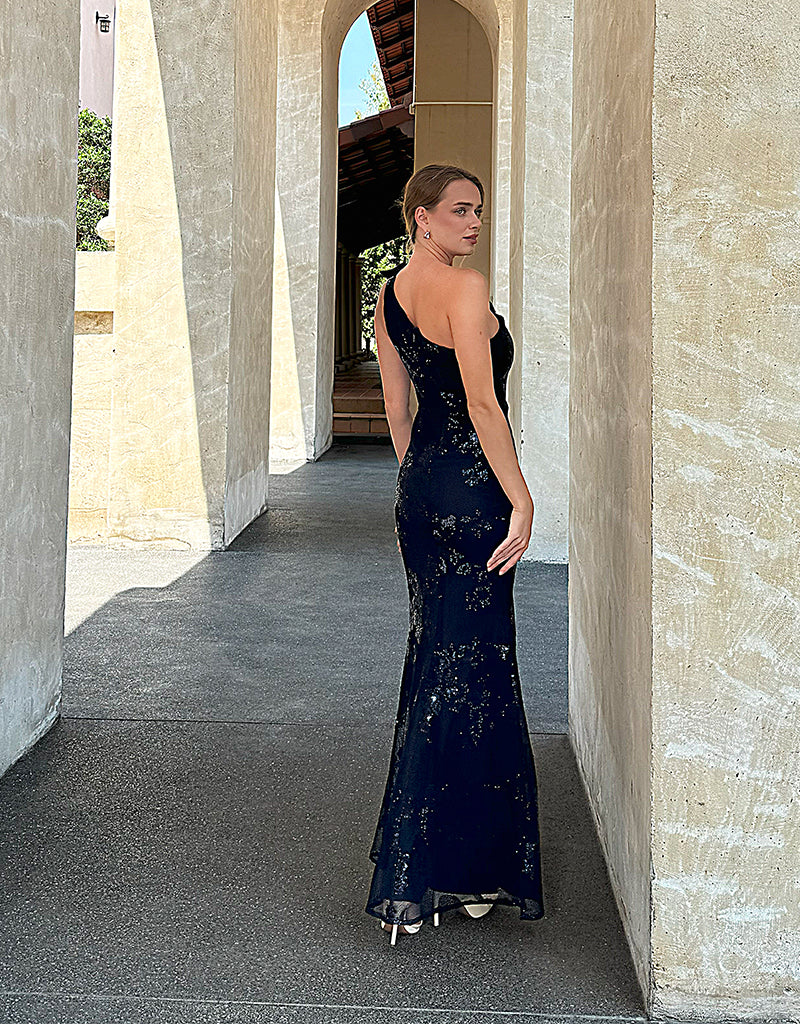 Demand attention from the room for all the right reasons. The Jessie is a show stopper with an extravagant one-shoulder bow that is guaranteed to elevate your look. The intricate honeycomb mesh will cover you head to toe and shimmer at every catch of light all night.