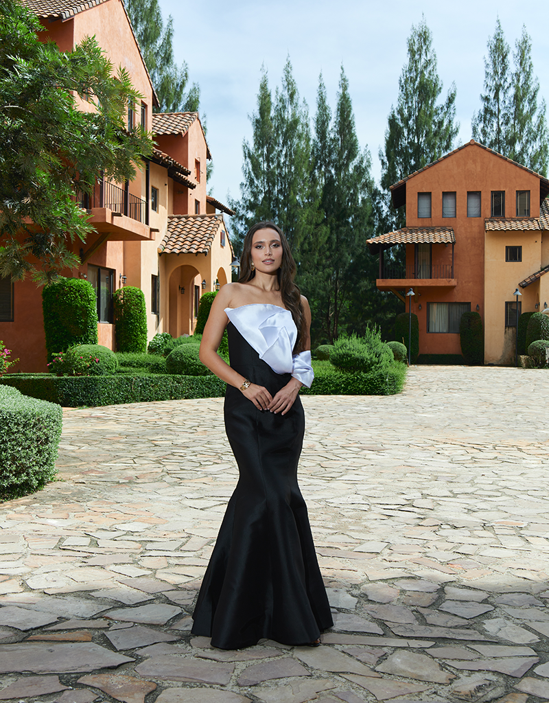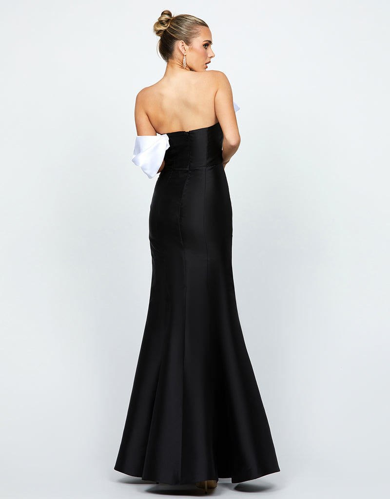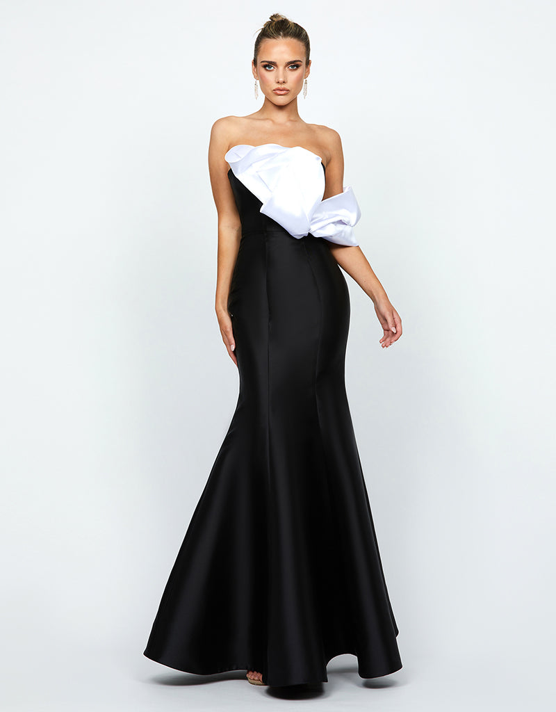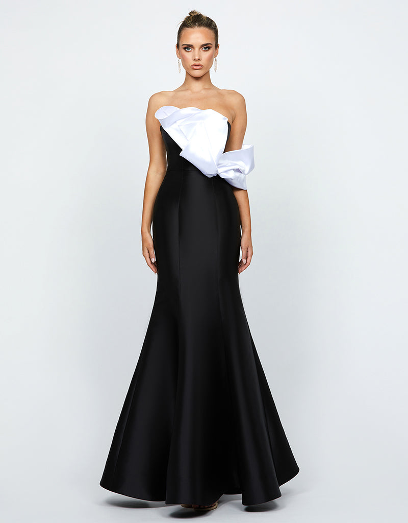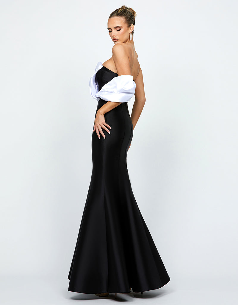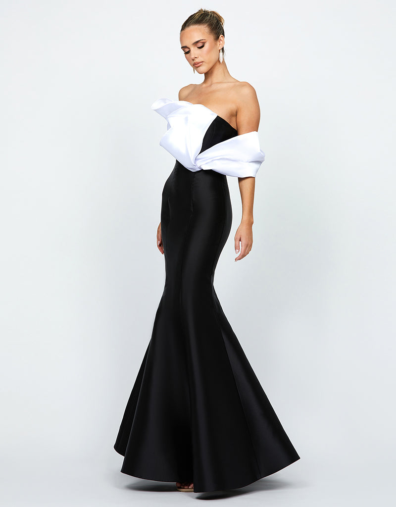 The Emely gown is a stunning blend of drama and elegance, featuring a strapless neckline with a bold contrast ruffle sleeve for a fashion-forward touch. Designed with a structured bodice and built-in cups, it offers a sculpted and supportive fit, while the dramatic fishtail skirt enhances your silhouette with effortless grace. Crafted from luxurious Duchess Satin and finished with an invisible back zip closure and full lining, this gown is perfect for making a statement at any special occasion.