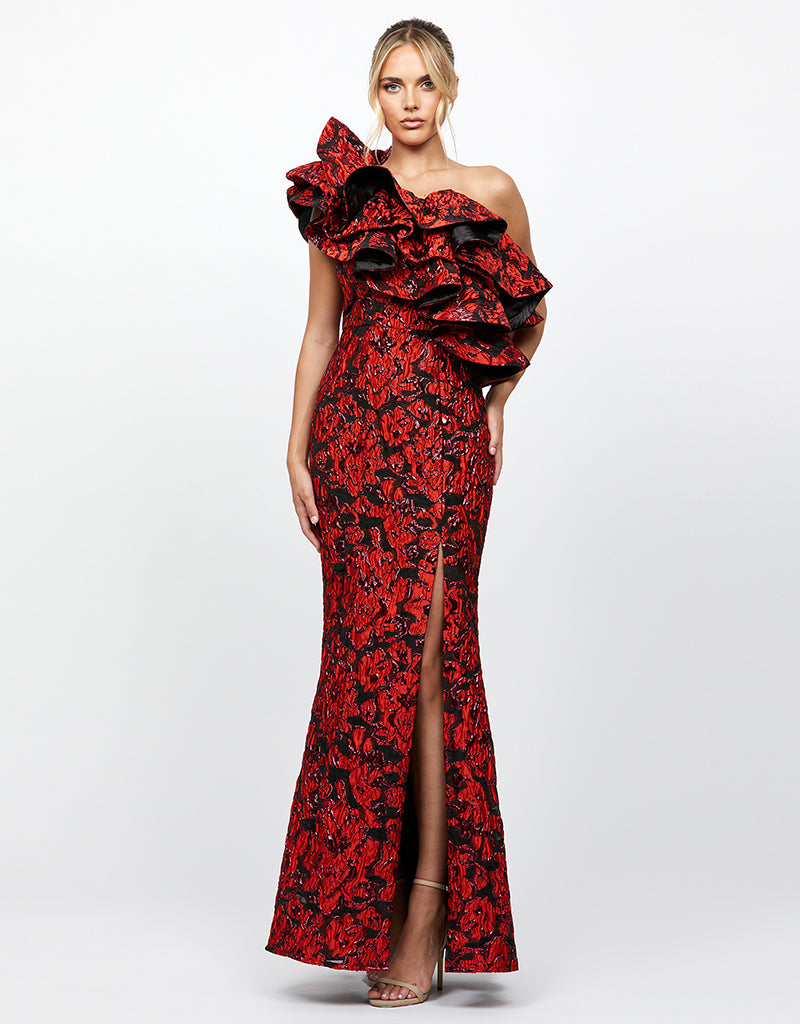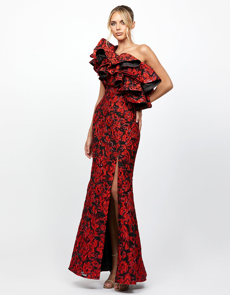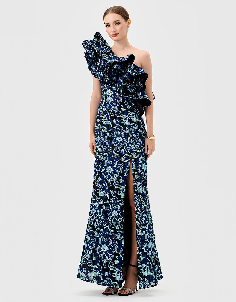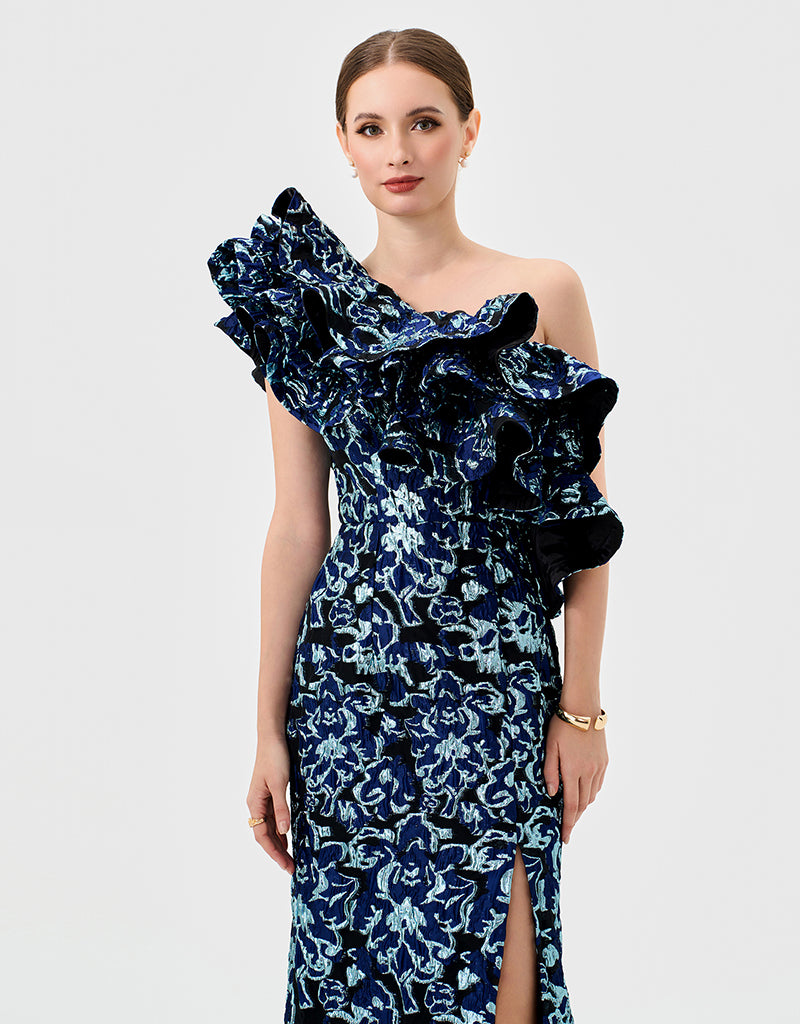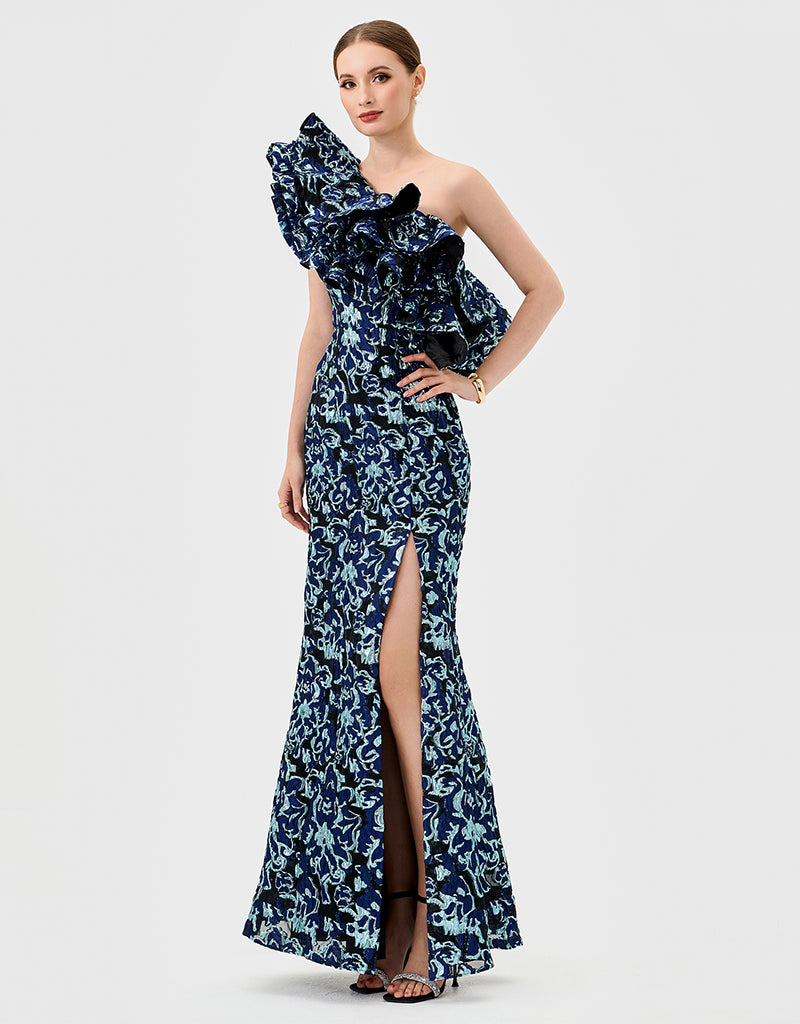 Make a dramatic entrance in this show-stopping one-shoulder gown, crafted from luxurious jacquard fabric for a textured, high-fashion finish. Featuring a bold front and back ruffle detail that cascades from the neckline, this gown is all about striking silhouettes. The structured bodice includes boning and bust cups for a sculpted, supportive fit, flowing into a full-length fishtail skirt that hugs the figure and finishes with a sultry front side split. Fully lined and finished with an invisible side zip, this gown is perfect for your next formal affair.