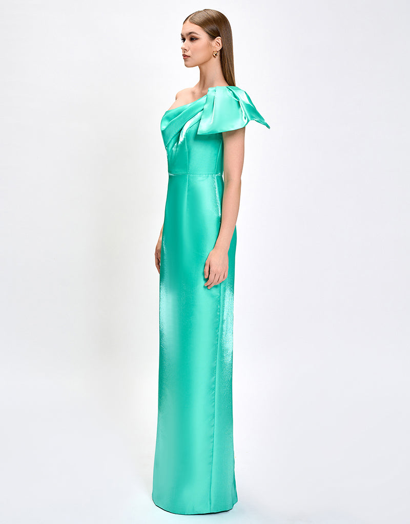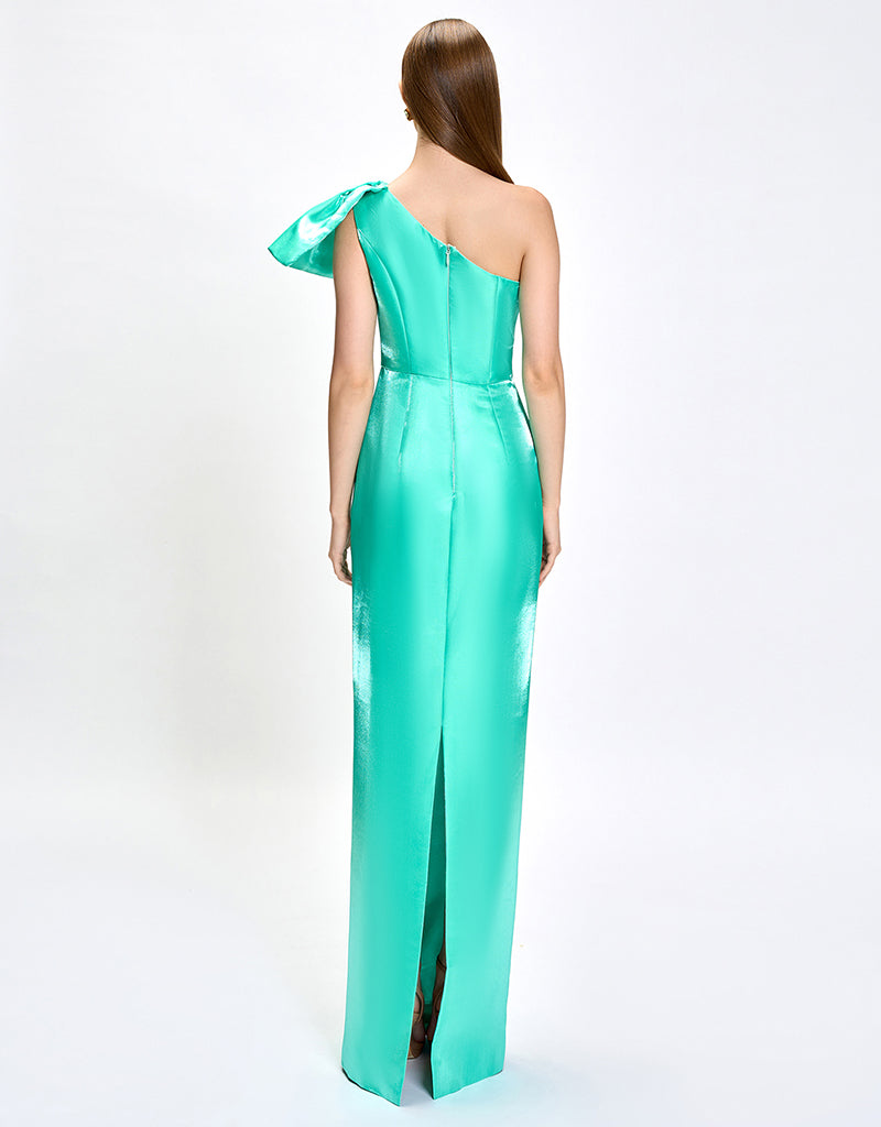 Sophisticated and dramatic, this full-length gown is crafted from luxurious high-sheen organza for a sleek, structured finish. Featuring an asymmetric one-shoulder neckline with a statement bow detail, it adds modern flair while highlighting the décolletage. The fitted bodice with built-in bust cups and subtle panel seaming provides shape and structure, flowing into a full-length column skirt with a back split for elegant movement. Fully lined and completed with an invisible back zip, this gown is perfect for formal events or red-carpet occasions.