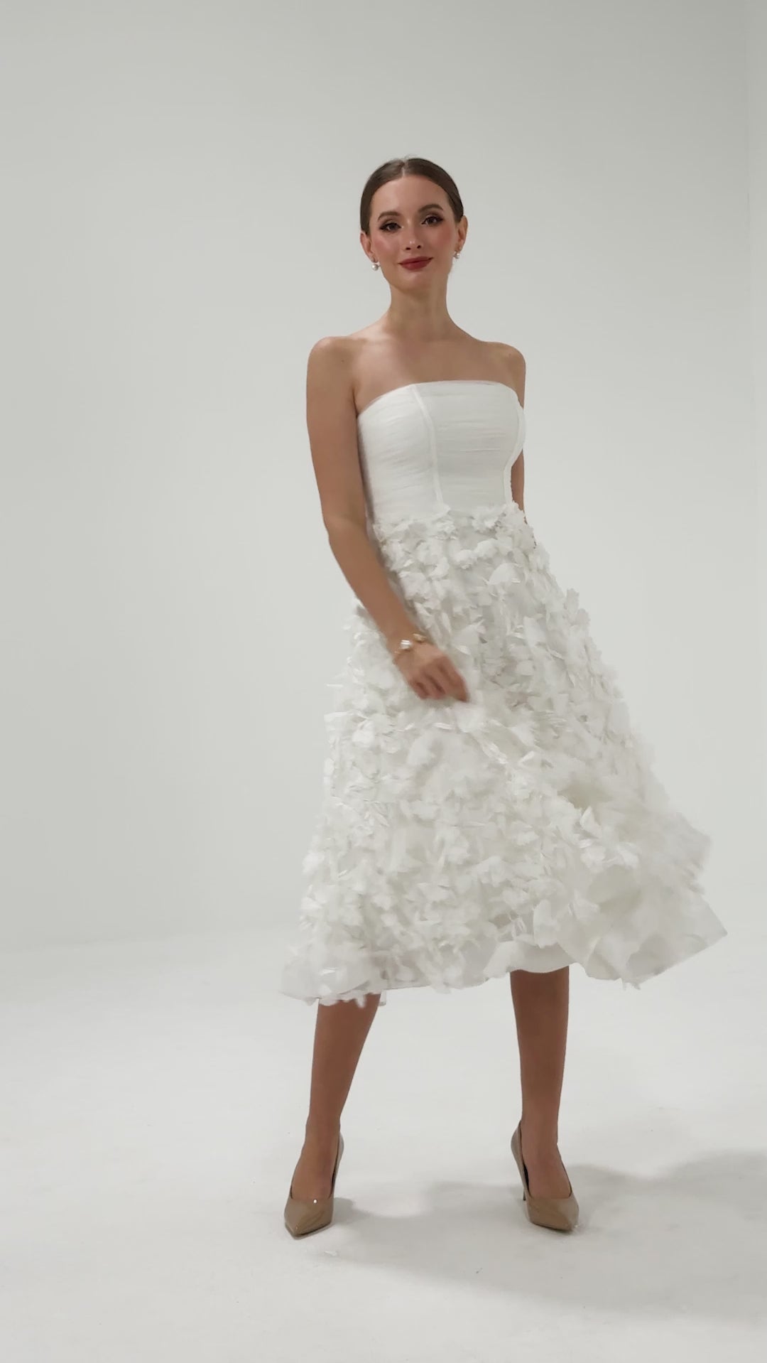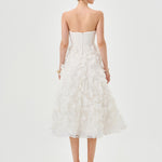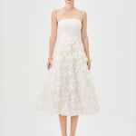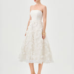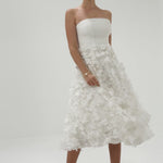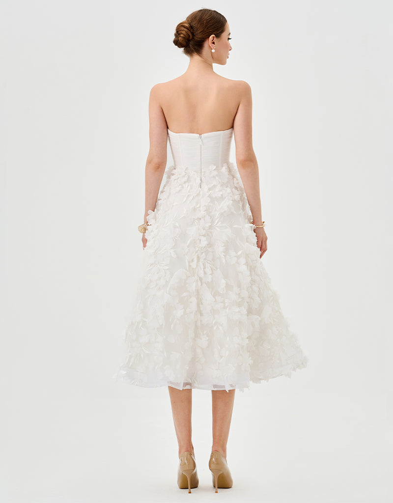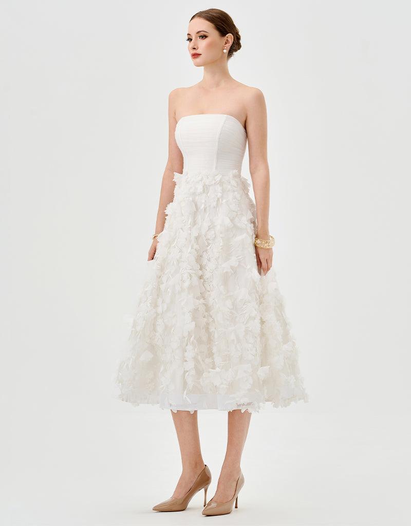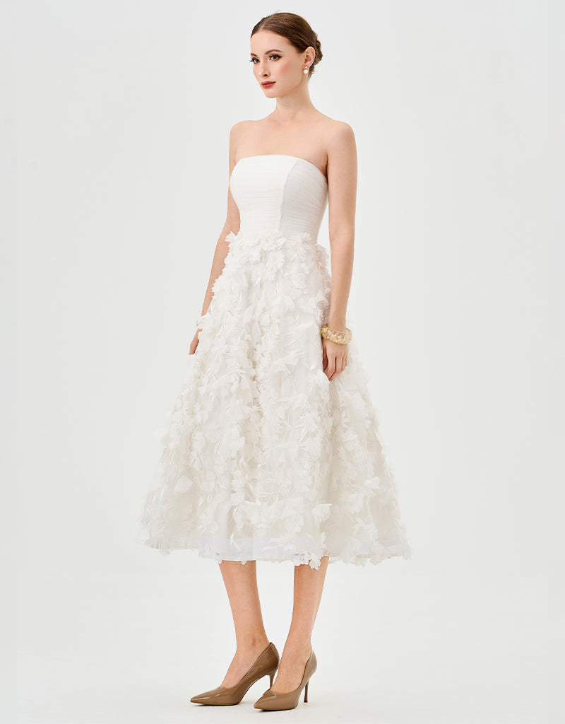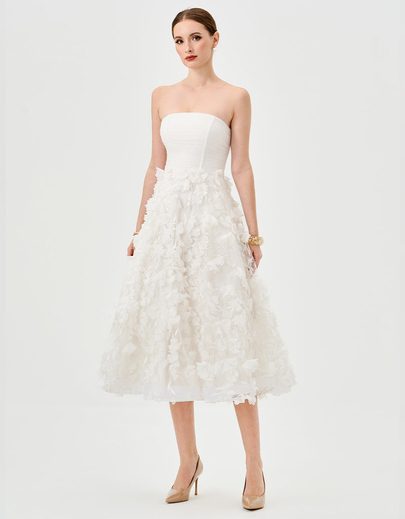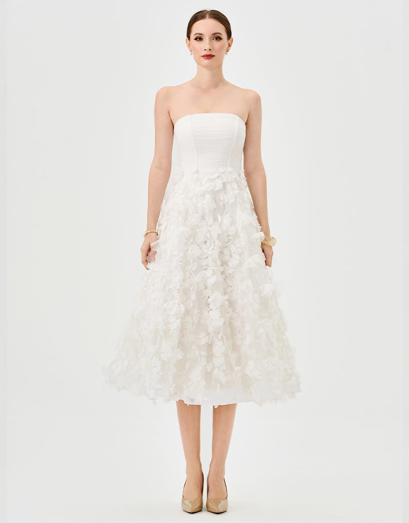 The straight-across strapless neckline with all-over gathered detail creates a chic, contemporary frame, while the tapered waistline with boning and built-in bust cups offers a flattering, structured fit. Falling into a 3D floral embroidered A-line midi skirt, the dress combines texture and elegance for a standout look. Fully lined with an invisible back zip, it delivers both style and comfort in one polished silhouette.