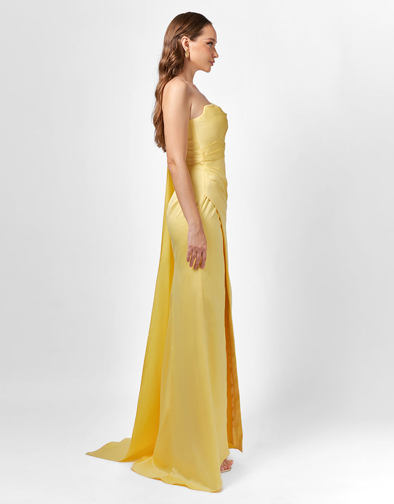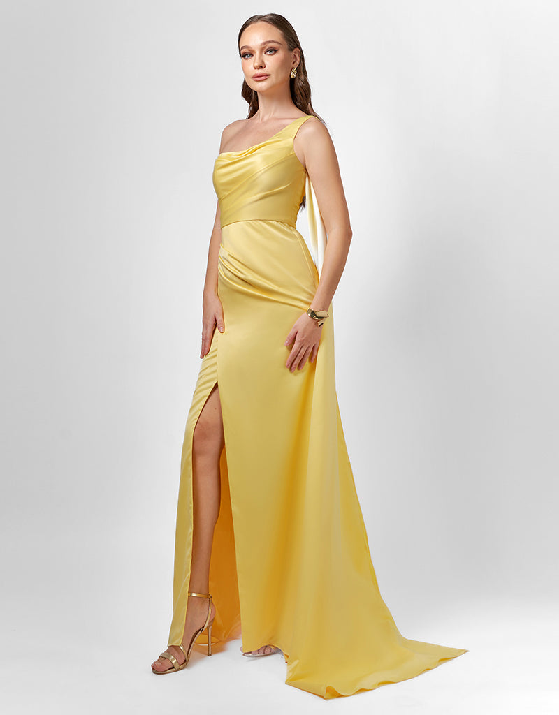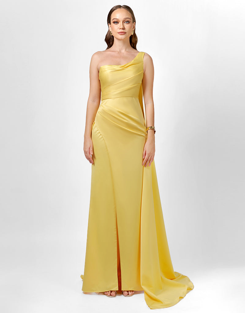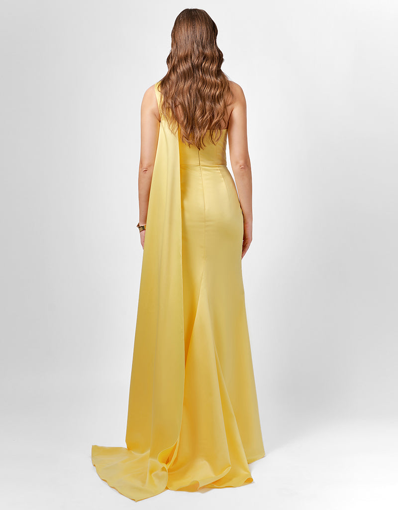 Turn heads in the stunning Davina gown, featuring a dramatic one-shoulder neckline with a thick strap and a statement floor-length cape. The structured bodice is beautifully draped across the bust with built-in cups for added support. A crossover fishtail skirt adds elegant movement, complete with a sultry side front split and a sweeping back train. Crafted in luxe satin and fully lined for a flawless finish, the Davina gown closes with an invisible zip at the back for a seamless silhouette.