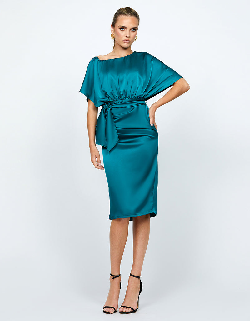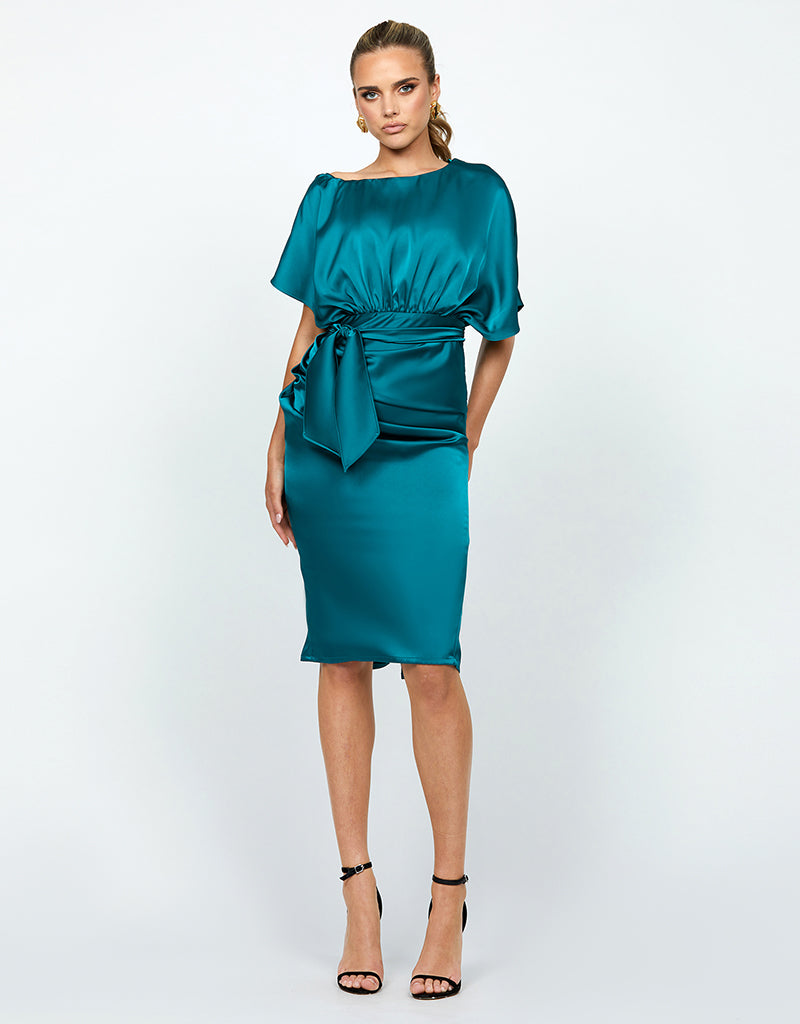 Make a statement in this drape satin knee-length dress, designed for timeless sophistication. The asymmetric one-shoulder neckline is complemented by a soft flutter sleeve, creating a graceful and feminine touch.
