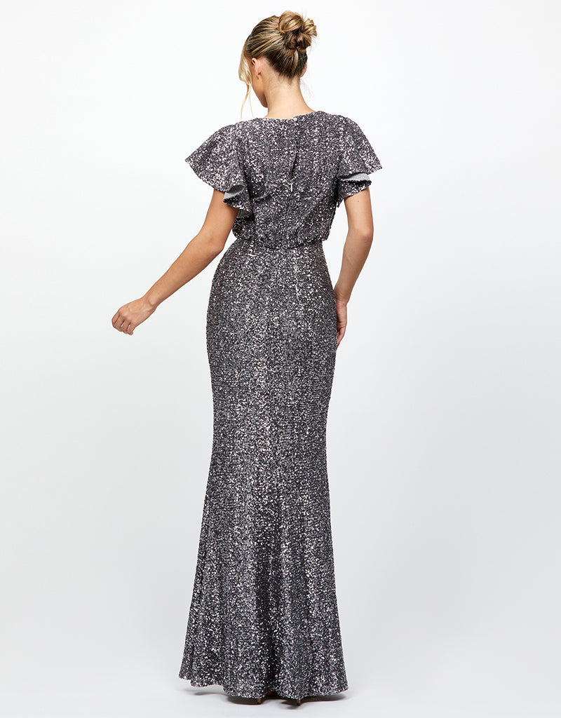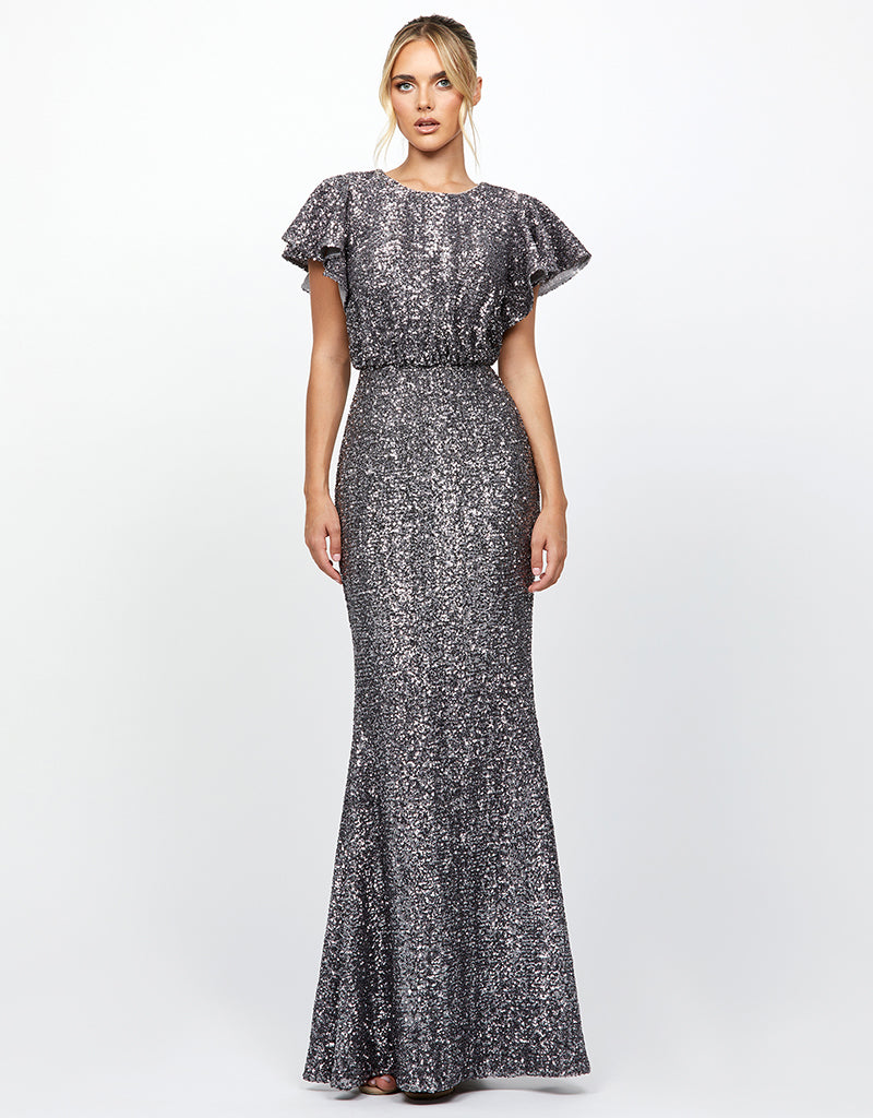 Exude timeless glamour in this sophisticated sequin gown. Featuring a classic high round neckline and delicate flutter cap sleeves, this silhouette offers elegance with a touch of drama. The blouson waist creates a soft, flattering drape, while the full-length fishtail skirt sculpts the figure for a graceful finish. A subtle keyhole back slit adds intrigue, complemented by an invisible zip and full lining for a comfortable, secure fit. Crafted from glimmering sequin fabric, this gown is perfect for black-tie occasions, mother of the bride moments, or evening events where elevated style is a must.