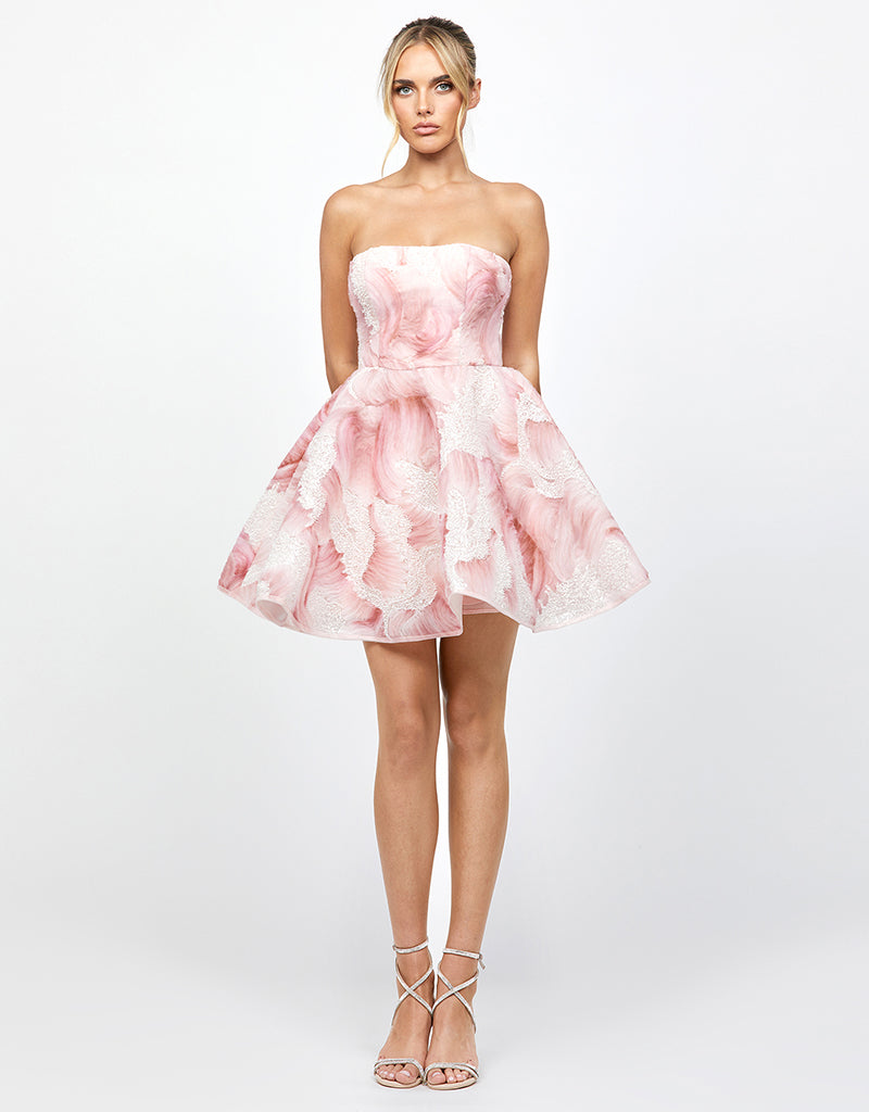 Playful yet polished, this mini dress is crafted from intricate 3D embroidered beaded net lace and mesh for a beautifully textured finish. Featuring a clean, straight-across neckline, the structured bodice is designed with built-in cups and boning for a supportive, sculpted silhouette. The A-line mini skirt adds a flirty touch with its crisp shape and flattering fit. Fully lined and finished with an invisible back zip closure, this standout piece is perfect for cocktail parties, bridal events, or special celebrations.