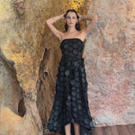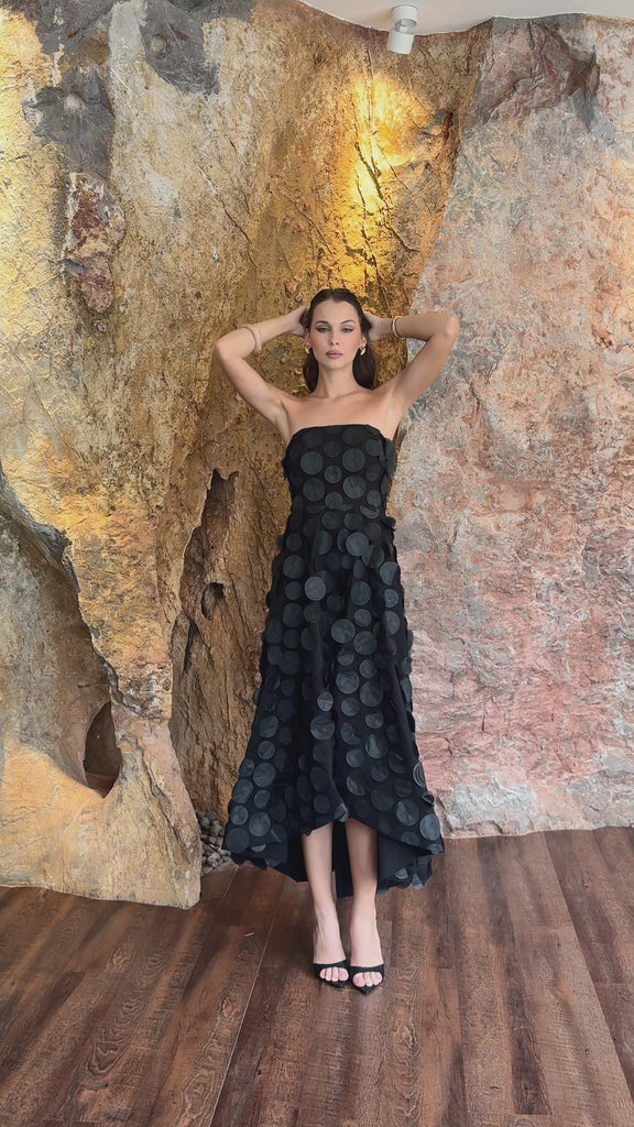 Delicate detail meets modern drama in this standout strapless gown. Featuring a clean, straight-across neckline and a structured boned bodice with built-in cups, this silhouette is designed to support and flatter. The A-line skirt adds volume and movement, finished with a striking hi-lo hemline that showcases your shoes with flair. Crafted from intricate laser cut 3D circle fabric, this dress offers a unique texture and a truly elevated finish. Fully lined and complete with an invisible back zip, it's the perfect choice for fashion-forward formal events, weddings, or special occasions.