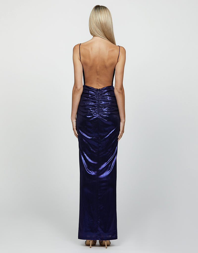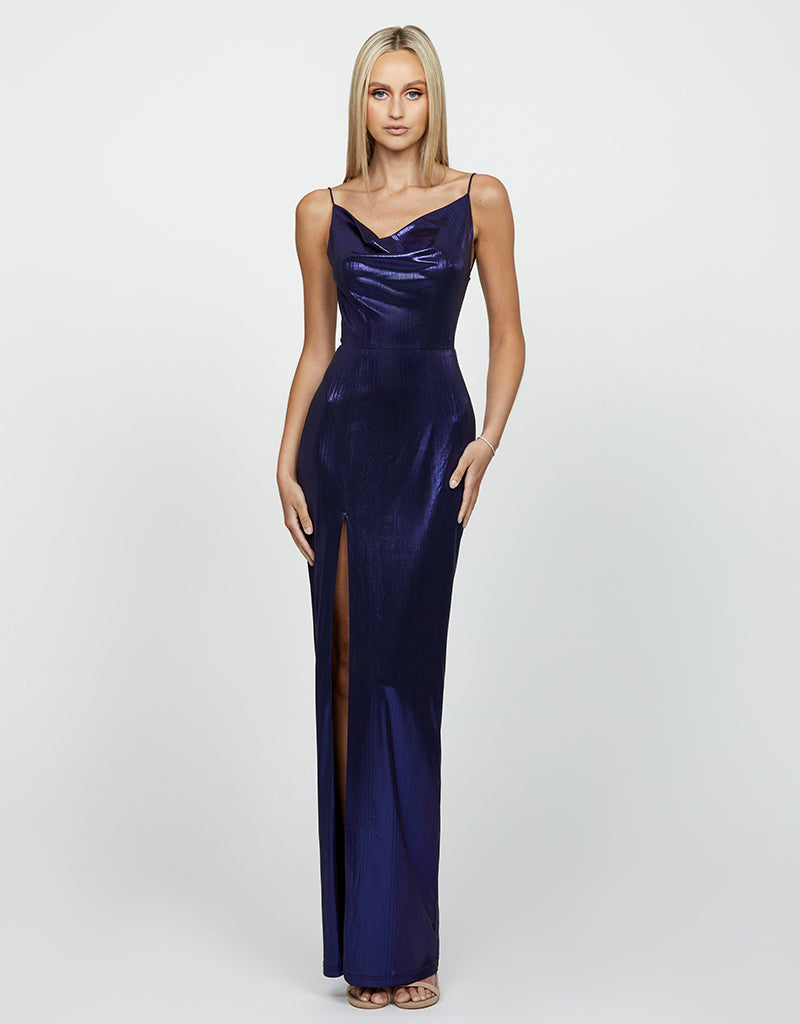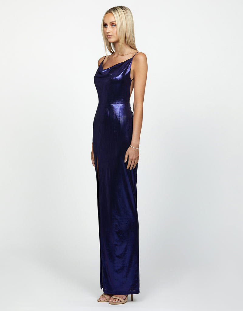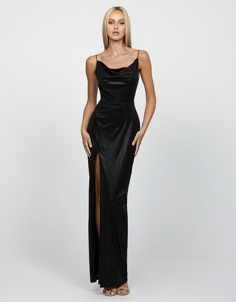 The Veronika Cowl Neck is not just a dress; it's a lyrical celebration of grace that waltzes along your silhouette, enveloping you in its elegant backless bodice graced with metallic stripes. It speaks of the pledge of endless joy and undeniable enchantment at every gathering, ensuring you embody a captivating essence of eternal magnetism.