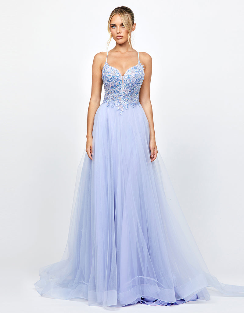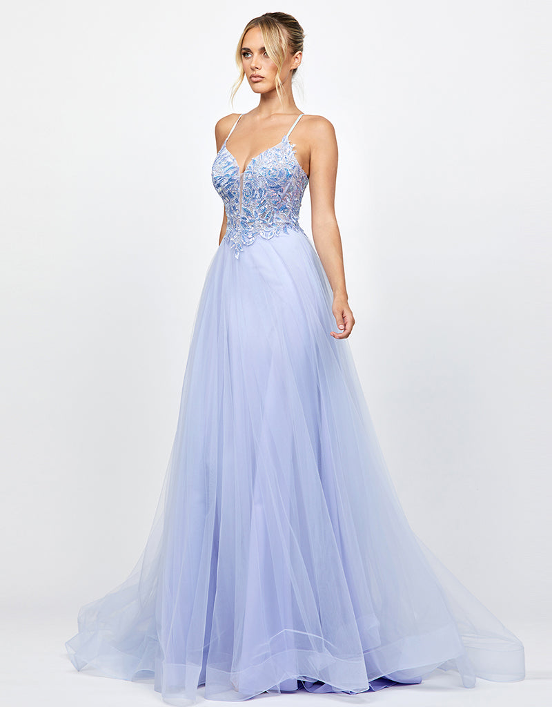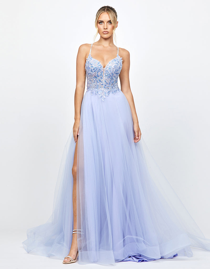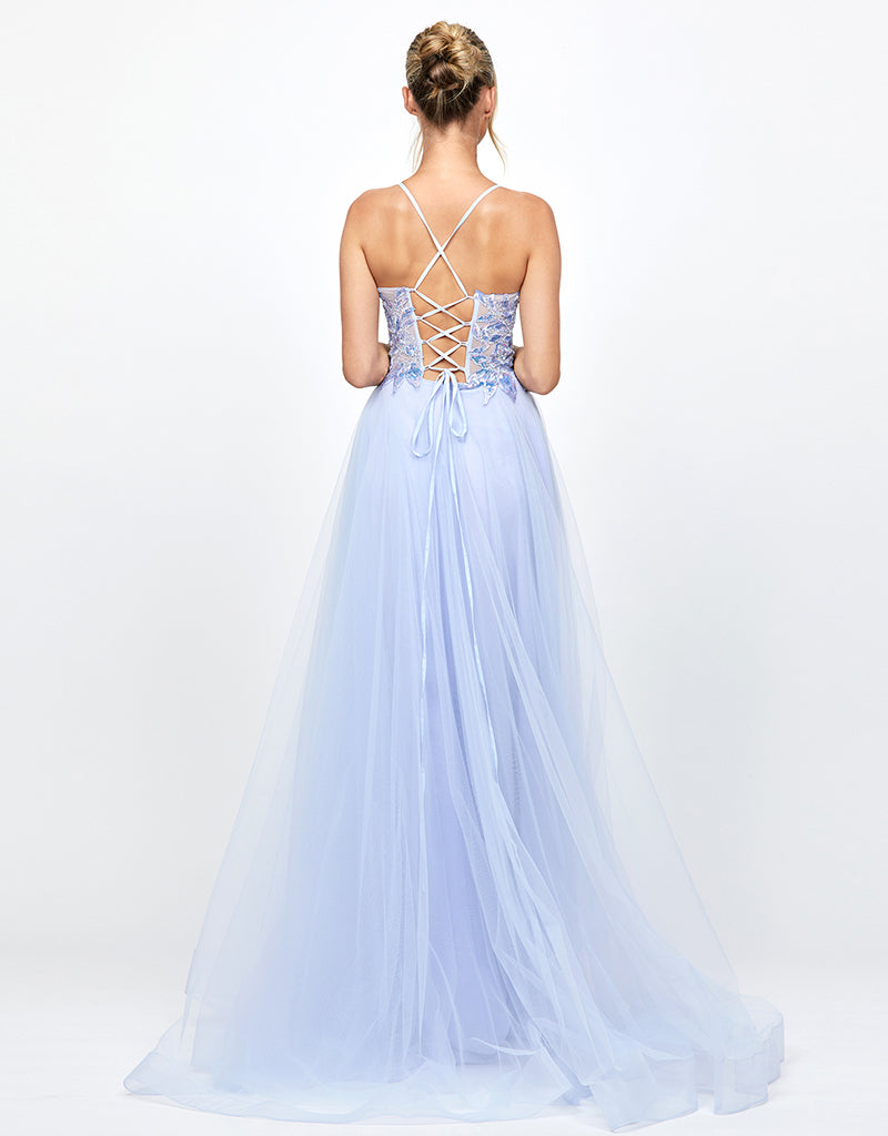 Elevate your style with this stunning tulle and lace dress, featuring a partially sheer bodice adorned with delicate lace appliqué and a modesty mesh insert for a hint of allure. The bodice is expertly structured with built-in bust cups and an eye-catching open strappy back that adds a modern twist. The flowing A-line skirt includes a crinoline hemline for added volume, a side slit for effortless movement, and a graceful back skirt detail. Fully lined with an invisible back zip closure, this dress perfectly balances romantic elegance and contemporary design—ideal for weddings, formal events, or special occasions.