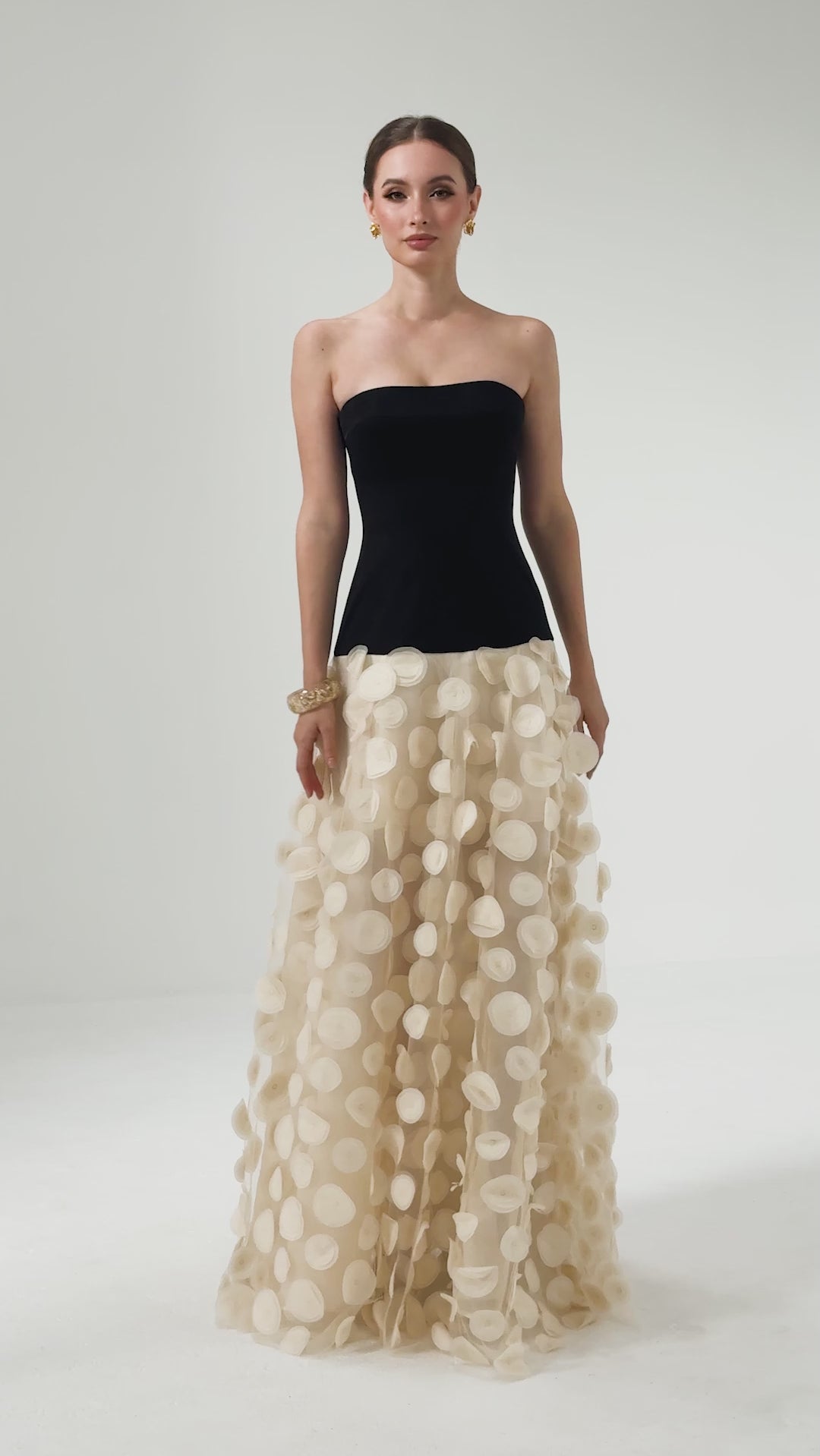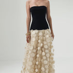 This strapless design features a straight neckline and structured bodice with built-in cups for support. Defined by a contrast dropped waistline, it falls into a voluminous A-line skirt crafted from sheer tulle with oversized polka-dot texture. The bodice is fully lined, while the skirt is partially lined to enhance the lightness of the fabric. Finished with an invisible back zip for a seamless close.