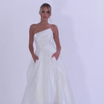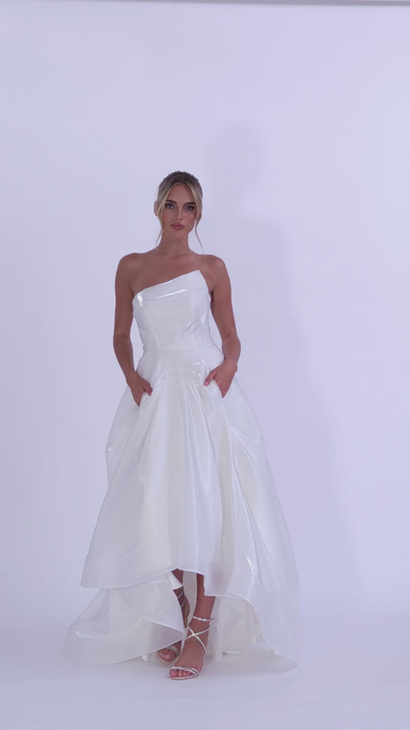 Dramatic and modern, this high-low gown is crafted from radiant high sheen organza for a look that’s both bold and elegant. Featuring an asymmetrical gathered neckline with a striking one-shoulder peak detail, the fitted bodice is structured with built-in bust cups and boning for a flawless silhouette. The voluminous hi-lo skirt is finished with a crinoline hemline, subtle train, and practical front side pockets for a contemporary touch. Fully lined and secured with an invisible back zip closure, this statement gown is perfect for formal occasions, red carpet events, or fashion-forward bridal looks.