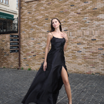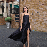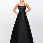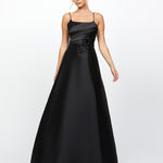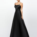 Sleek, refined, and effortlessly glamorous — this full-length gown is a timeless showstopper. Featuring a soft scoop neckline with delicate spaghetti straps, the tucked bodice adds dimension and flatters the silhouette. A touch of sparkle comes from the elegant embellished trim detail, adding a luxurious finish. Crafted from luxe duchess satin, the gown falls into a classic A-line skirt with a daring front side split, offering both movement and drama. Fully lined and finished with an invisible back zip, this design is perfect for weddings, galas, or any black-tie occasion where you want to shine.