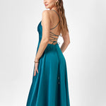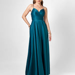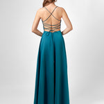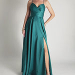 Timeless elegance with a modern twist, the Spaghetti Strap Satin Gown is the perfect choice for evening sophistication. Designed with a crossover V neckline and delicate spaghetti straps, the bodice is structured with boning and built-in bust cups to flatter and support. A tapered waistline flows into a soft A-line skirt with a sultry side split, while the low open strappy back adds a touch of allure. Crafted in smooth satin and finished with a full lining and invisible zip, this gown moves beautifully from every angle.