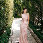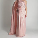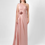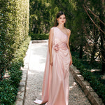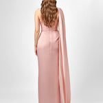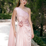 Bold, sophisticated, and undeniably striking — the One-Shoulder Satin Cape Gown is designed to leave a lasting impression. Showcasing a sculpted one-shoulder neckline with a floor-length draped cape, the pleated bodice is artfully tucked and fitted with built-in bust cups for added shape and support. A delicate fabric flower detail lends a romantic touch, while the full-length draped skirt flows effortlessly with every step. Fully lined and finished with an invisible back zip, this gown is the ultimate showstopper for formal occasions.