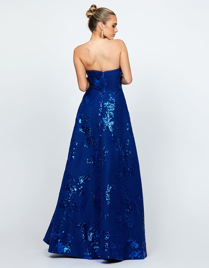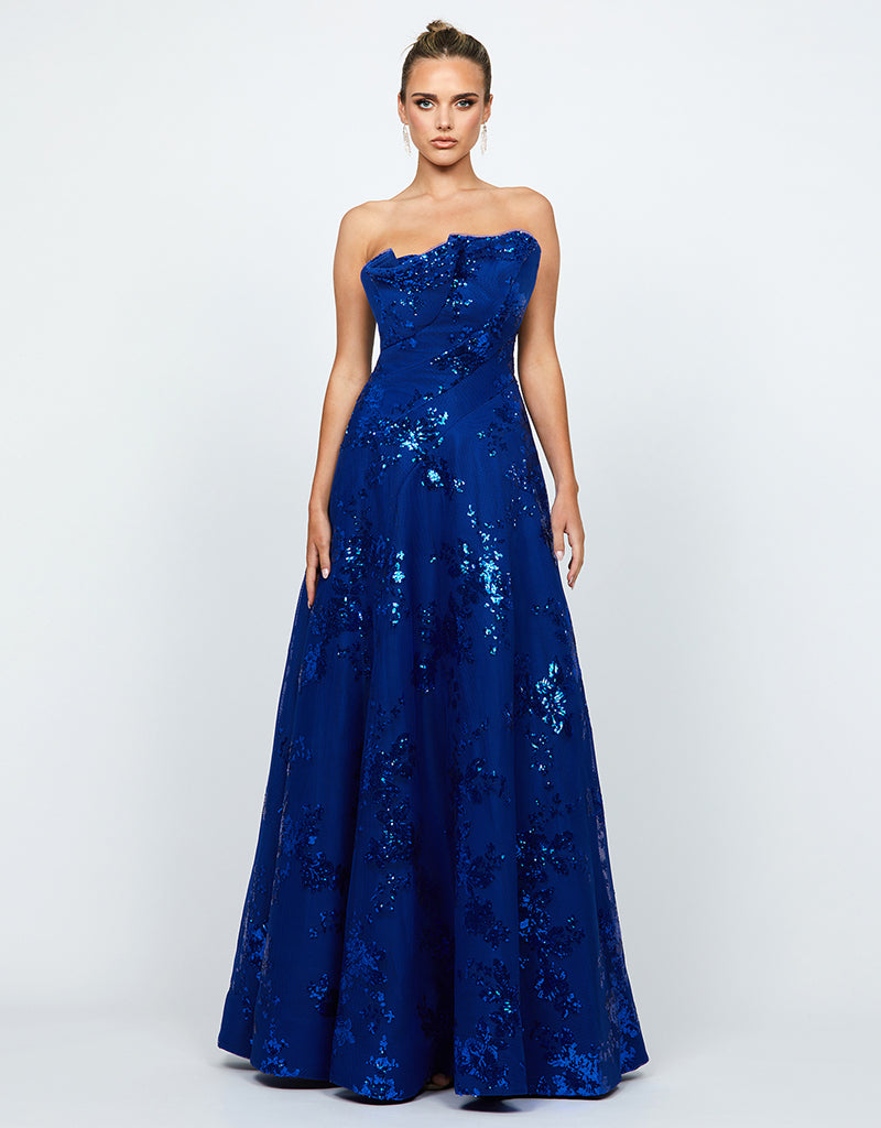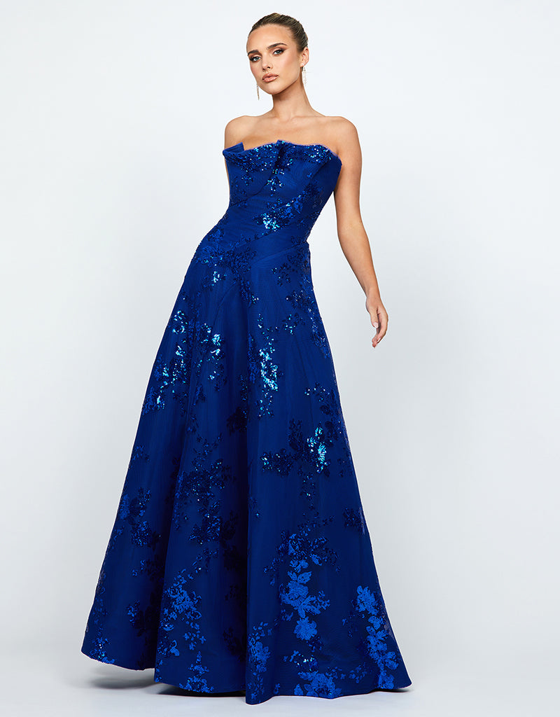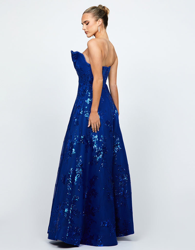 The Kendra gown is the perfect blend of elegance and modern style. Featuring an asymmetric strapless neckline with a statement ruffle detail, this dress exudes sophistication. The panel-detailed bodice with boning and built-in cups ensures a structured, flattering fit, while the full-length A-line skirt creates a timeless silhouette. Designed with an invisible back zip closure and full lining for a seamless finish, the Kendra is crafted from luxurious bonded mesh with sequins, adding a subtle sparkle that’s perfect for any special occasion.