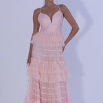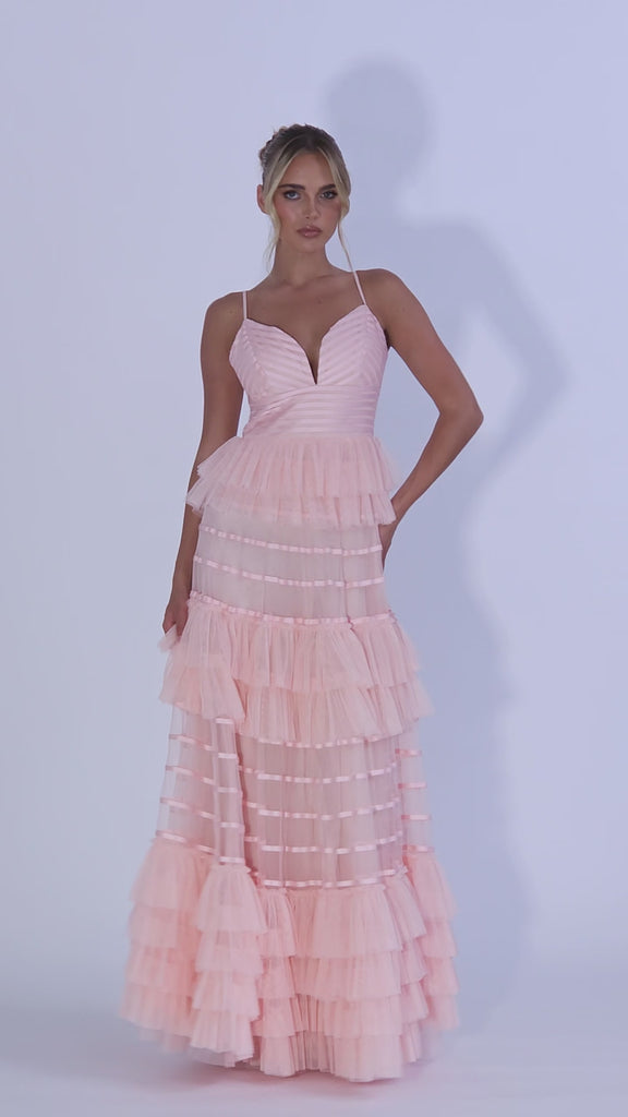 Make an entrance in this romantic full-length gown, featuring a plunging sweetheart V neckline and delicate spaghetti straps in elegant self-stripe fabric. The wide waistband flatters the silhouette, while built-in bust cups provide extra support. A flowing tiered mesh skirt with striped panel details adds soft movement and texture. Fully lined with an invisible back zip, this dreamy design is perfect for your next formal occasion.