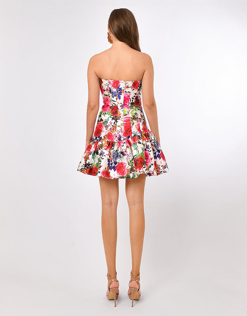 Step into a floral fantasy with this exquisite mini dress, featuring a straight across strapless neckline with built-in cups for a seamless fit. The dropped waistline is enhanced by front and back panel detailing, creating a flattering silhouette. The bespoke bubble hem of the mini skirt adds a touch of playful elegance. Made from luxurious Printed Duchess Satin with a vibrant floral design, this dress is fully lined and finished with an invisible back zip closure, offering both comfort and style for any special occasion.