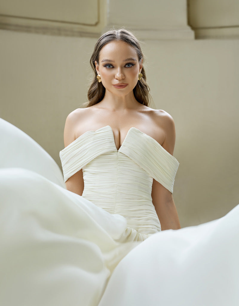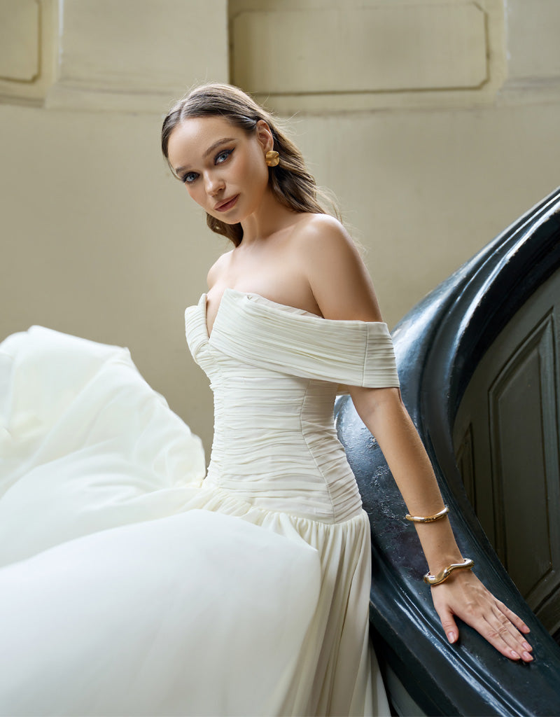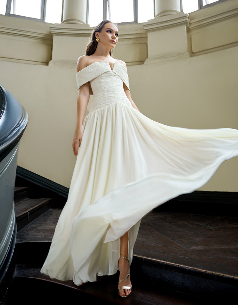 Soft, romantic, and effortlessly elegant, this chiffon gown is designed to flatter from every angle. It features a classic V-neckline paired with delicate pleated off-shoulder sleeves for a timeless silhouette. The fitted bodice is beautifully ruched to enhance shape and definition, flowing into a dropped waistline that elongates the figure. A full-length A-line skirt drapes gracefully, creating movement and flow with every step. Fully lined and finished with an invisible back zip, this gown is the perfect choice for weddings, formal occasions, and evening events.