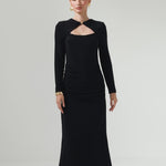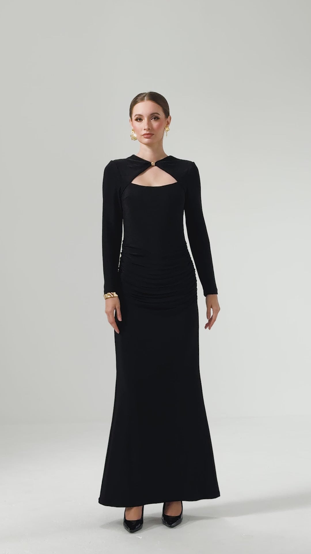 Daring yet sophisticated, this full-length gown is designed to captivate. Featuring a high neckline with a bold wide triangle cut-out, it strikes the perfect balance between coverage and allure. The fitted long sleeves create a sleek silhouette, while the soft drape jersey fabric hugs the body in all the right places. Side and back ruching detail add a flattering touch to the column-style skirt, enhancing your natural curves. Complete with an invisible back zip and partial lining, this gown is the ultimate choice for statement evening dressing, cocktail events, or black-tie affairs.