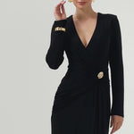 Elegance meets allure in this beautifully draped jersey gown. Featuring a crossover V-neckline and fitted long sleeves, the silhouette is sleek, flattering, and effortlessly refined. The cinched waist is accentuated with a chic metal trim detail and soft side sash, creating a defined hourglass shape. The column-style maxi skirt flows into a high front side split, offering movement and a touch of drama. Made from soft, stretch drape jersey with partial lining and an invisible back zip, this style balances comfort and glamour — perfect for weddings, evening events, and formal occasions.