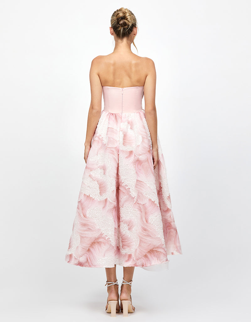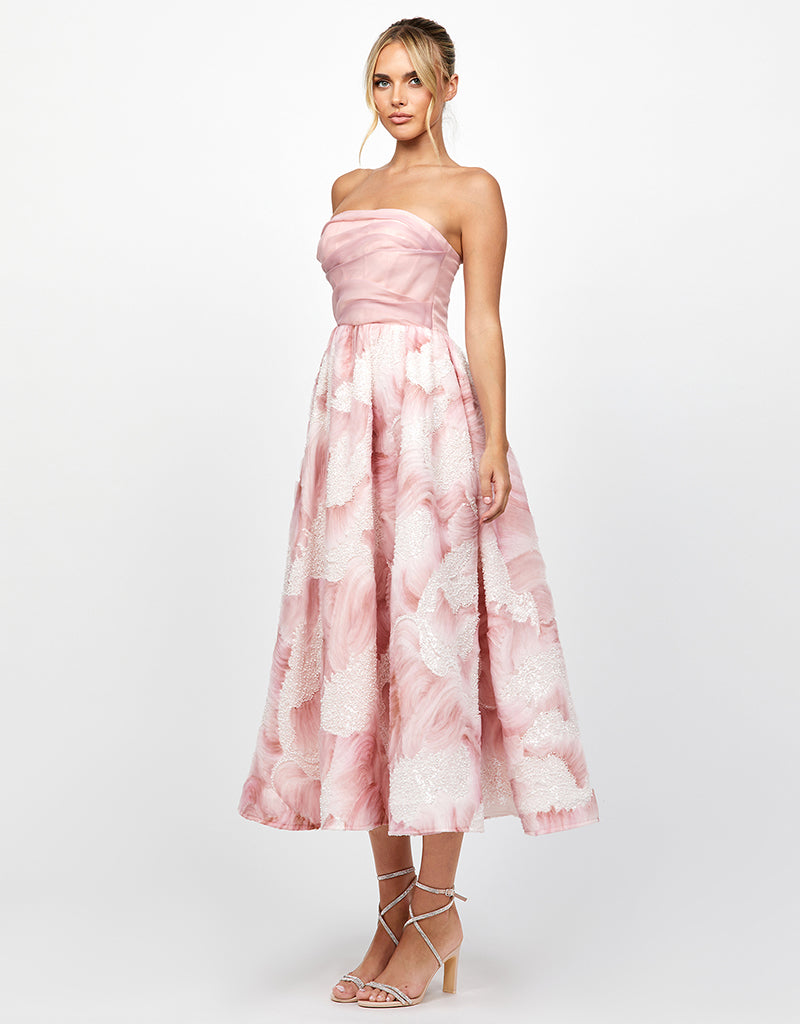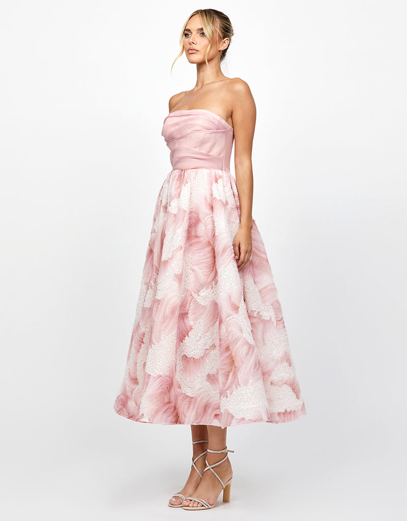 Elegant with a touch of whimsy, this midi dress is crafted from delicate 3D embroidered beaded net lace and soft organza for a romantic, textured look. Featuring a straight-across strapless neckline, the design is elevated by a draped organza overlay and subtle taping detail for added depth and dimension. The structured bodice includes boning and built-in cups for a supportive, sculpted fit, while the A-line midi skirt is finished with a crinoline hemline for added volume and movement. Fully lined and complete with an invisible back zip closure, this piece is perfect for weddings, special occasions, or standout event dressing.